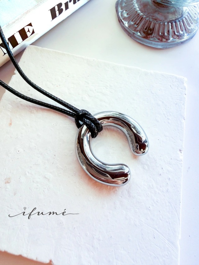 ― 新年におすすめ ― シンプルでありながら、印象に残る存在感。 ホースシュー(馬蹄)を思わせる、丸みのあるC字フォルムのペンダントが、胸元にさりげないアクセントを添えるコードネックレスです。 カットソーやニットなど、ベーシックな装いのアクセントとして。 さりげなくワンランクアップを叶えます。 ⸻ ■ ラッキーアイテムとしても ホースシューは「幸運を呼び込む」ラッキーモチーフとして、古くから親しまれてきました。 新しい年の始まりに、自分へのお守りとして。 また、大切な方への贈り物にもおすすめです。 ■ 紐を引っ張るだけで、簡単に長さ調節 留め具のない仕様で、 紐を引っ張るだけでお好みの長さに調節可能。 ・被って着けられるので忙しい朝もストレスフリー ・タートルネック、ニット、ワンピースなど幅広く対応 ・Y字バランスや胸元の位置も自由自在 その日のコーディネートに合わせて、バランスを楽しめます。 ⸻ ■ 素材について ・ペンダントトップ:ステンレス304 ・コード部分:合成紐(ブラック)約38cm ※身長160cmの方が最長で着けると、トップはおへその少し上(約10cm上)にくるバランスです。 合成紐は、軽くしなやかで癖がつきにくい素材。 結び目もきれいに整いやすく、シルエットを美しく保ちます。 金属部分にはステンレス304を使用し、金属アレルギーにも配慮しています。 ⸻ ■ コーディネート例 ・シンプルなニットに合わせてモダンに ・ワンピースのアクセントとして ・コートやジャケットの上から着けてもバランス良く 季節を問わず、長くお使いいただけるデザインです。 ⸻ ◇ パッケージについて ◇ 作品は ifumé オリジナルのチャック式パック に入れてお届けいたします。 切らずに開封できるため、アクセサリーの保管袋として繰り返しお使いいただけます。 そのままプレゼントにも◎ ⸻ ✧ 大切な方への贈り物に ✧ ギフト用に ifumé 特製ボックス をご用意しております。 銀の箔押しで ifumé ロゴをあしらった、上質感のある貼箱タイプのボックスです。 ・購入オプションよりお選びください (+350円/画像参照) ⸻ ■ ご注意 ・紐部分は強い摩擦や引っかけにご注意ください ・ハンドメイド作品のため、仕上がりには個体差がございます 関連作品 大好評! ダイヤモンドと同等の輝きの H&C(ハートアンドキューピット)ジルコニアを使用した 馬蹄ネックレス