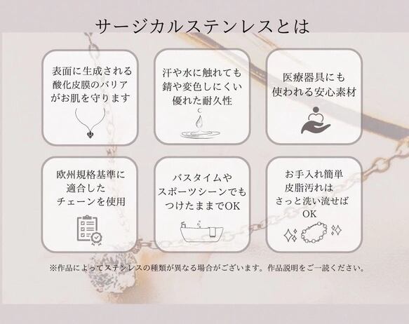 汗や水に強く、サビたり変色せずに長くご使用頂ける素材です。 ※全ての方にアレルギーが出ない訳ではございません。万が一異常が現れた場合はご使用をお控え下さい